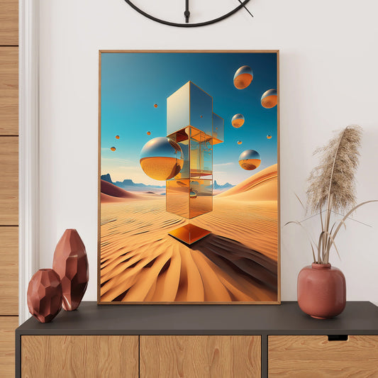 Surreal Desert Landscape Wall Art Print – Digital Download PDF | Floating Geometric Shapes Poster