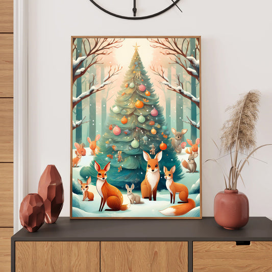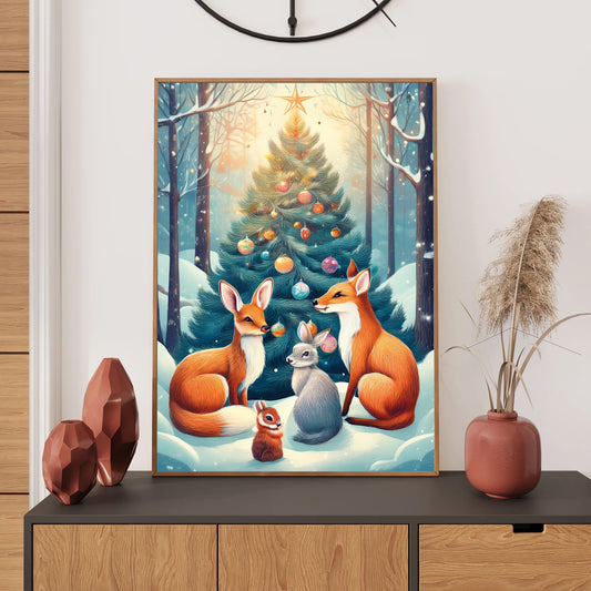 Woodland Animals Christmas Card – Digital Download | Fox, Deer, Rabbits & Owls by Tree | Cozy Winter Wall Art