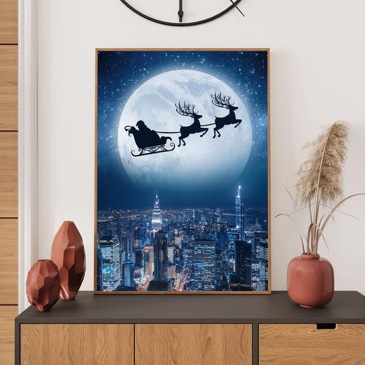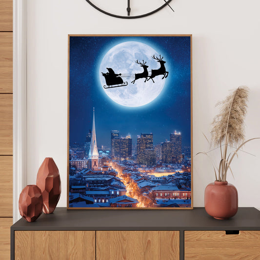 Santa Flying Over City Christmas Card – Digital Download | Magical Holiday Night Sky Art | Festive Wall Print