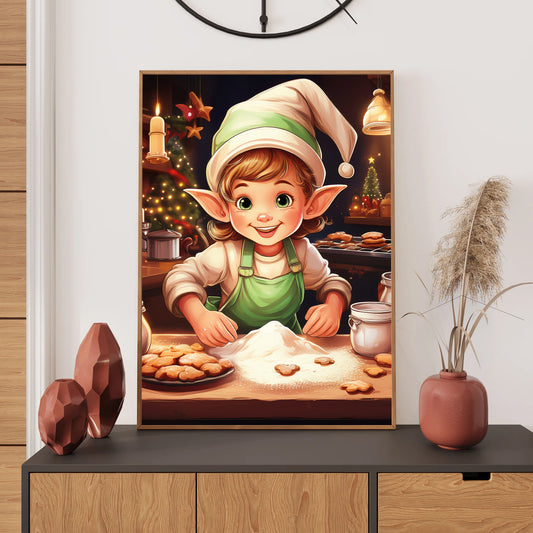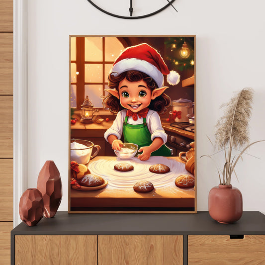 Tiny Elves Baking Cookies Christmas Card – Digital Download | Cozy Holiday Wall Art | Festive Kitchen Printable