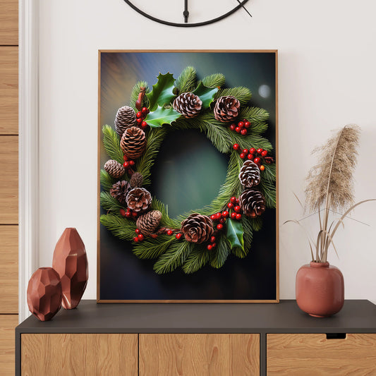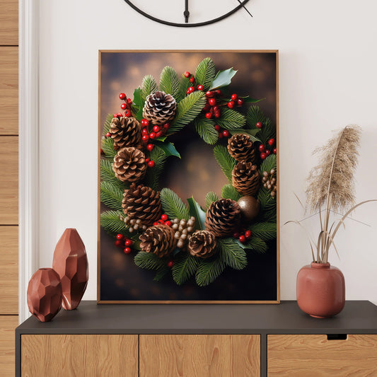 Elegant Christmas Wreath Card – Digital Download | Festive Pinecone Holiday Wall Art | Classic Winter Printable