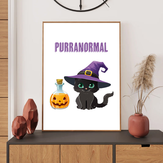 Cute Halloween Witch Cat Art – “Purranormal” Spooky Fun Digital Poster for Instant Download