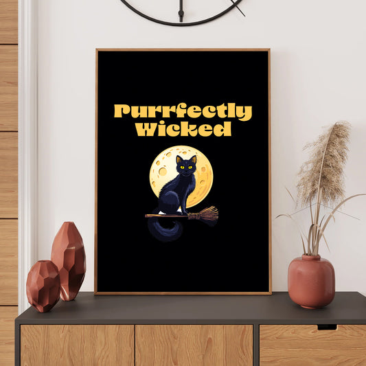 Cute Halloween Black Cat Art – “Purrfectly Wicked” Spooky Fun Digital Poster for Instant Download