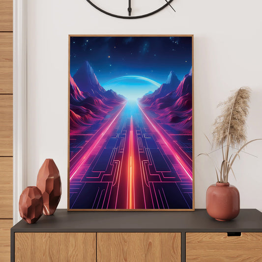Neon Pathway Mountain Landscape Digital Art Print – Retro Futurism Sunset | Synthwave Horizon Scene | Instant Download