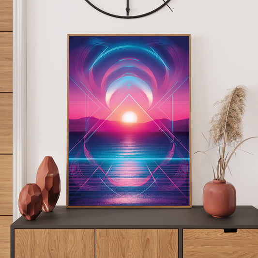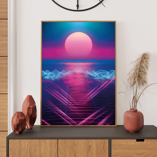 Neon Horizon Digital Art Print – Retro Futurism Sunset | Synthwave Ocean Scene | Instant Download