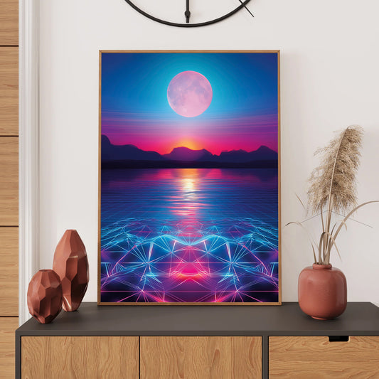 Neon Moonrise Digital Art Print – Retro Futurism Landscape | Synthwave Ocean Glow | Instant Download