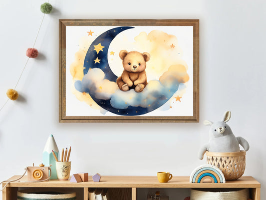 Baby Bear Nursery Wall Art Print – Moon & Clouds Celestial Baby Decor | Gender Neutral Room | Instant Download