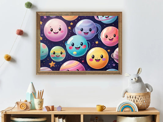 Planet Nursery Wall Art Print – Smiling Galaxy Pastel Space Decor | Baby & Kids Room | Instant Download