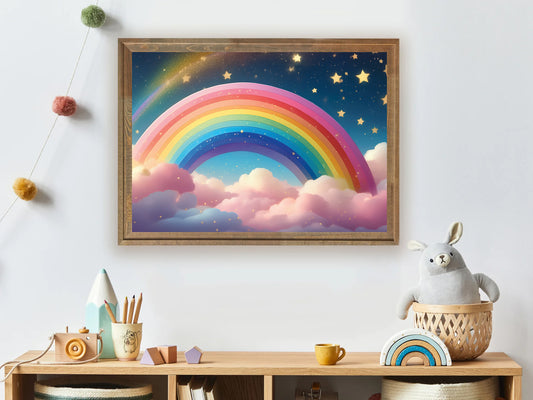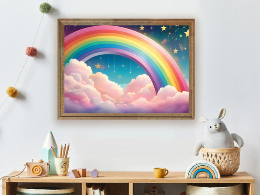 Rainbow Nursery Wall Art Print – Pastel Clouds & Stars Baby Decor | Gender Neutral Room | Instant Download