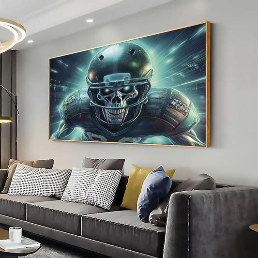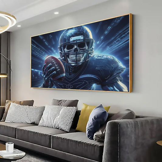 Skeleton Playing American Football Wall Art Print – Digital Download, Gothic Sports Skull Poster, Bold Football Artwork, Printable Decor for Man Cave or Game Room