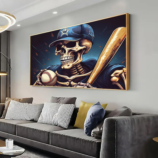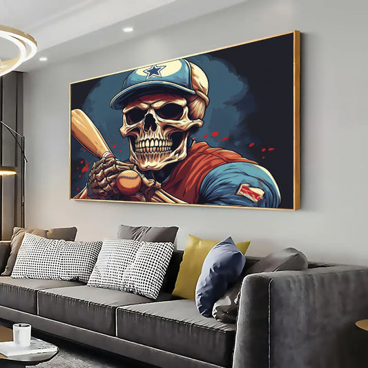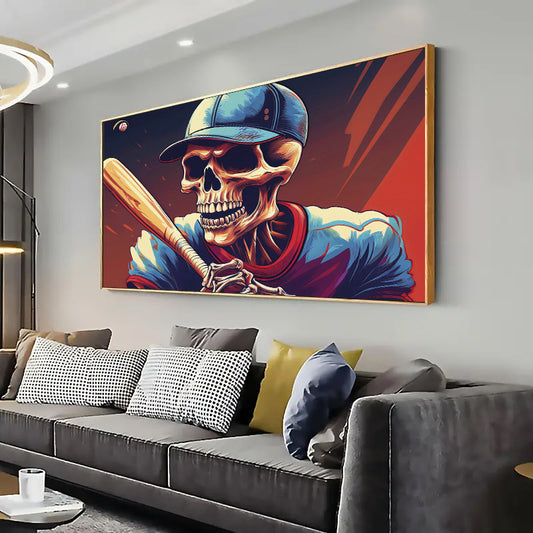 Skeleton Playing Baseball Wall Art Print – Digital Download, Gothic Sports Decor, Skull Athlete Poster for Game Room or Man Cave